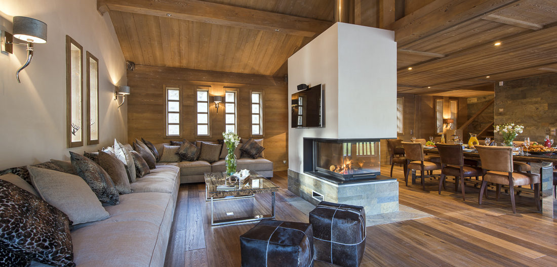 LIVING SPACES The bright, airy open-plan living and dining area commands breathtaking views of Mount Tovière. An expansive L-shaped sofa faces an impressive fireplace, creating the perfect gathering spot for families to unwind following exhilarating days on the slopes. Dining at Chalet Ambre becomes an elegant occasion beneath a beautiful chandelier suspended over the generous table seating ten in comfort. Guests enjoy satellite television and premium Bose audio throughout.